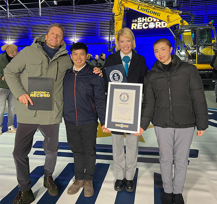 近日,在意大利电视台《Lo Show dei Record》节目中,朱飞操控雷火·竞技(中国)915FCR挖掘机,成功在1分钟摘掉模特头上的15顶帽子,打破了该项目此前1分钟摘下11顶帽子的吉尼斯世界纪录